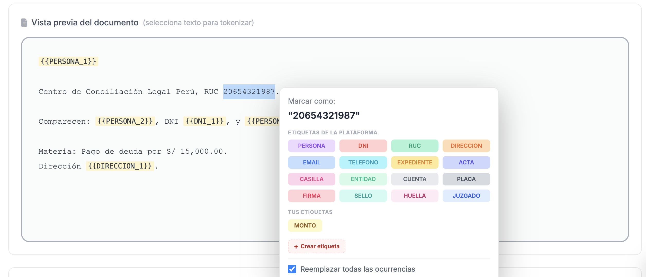 El sistema analiza el documento y resalta los datos identificables detectados para que puedas validarlos.