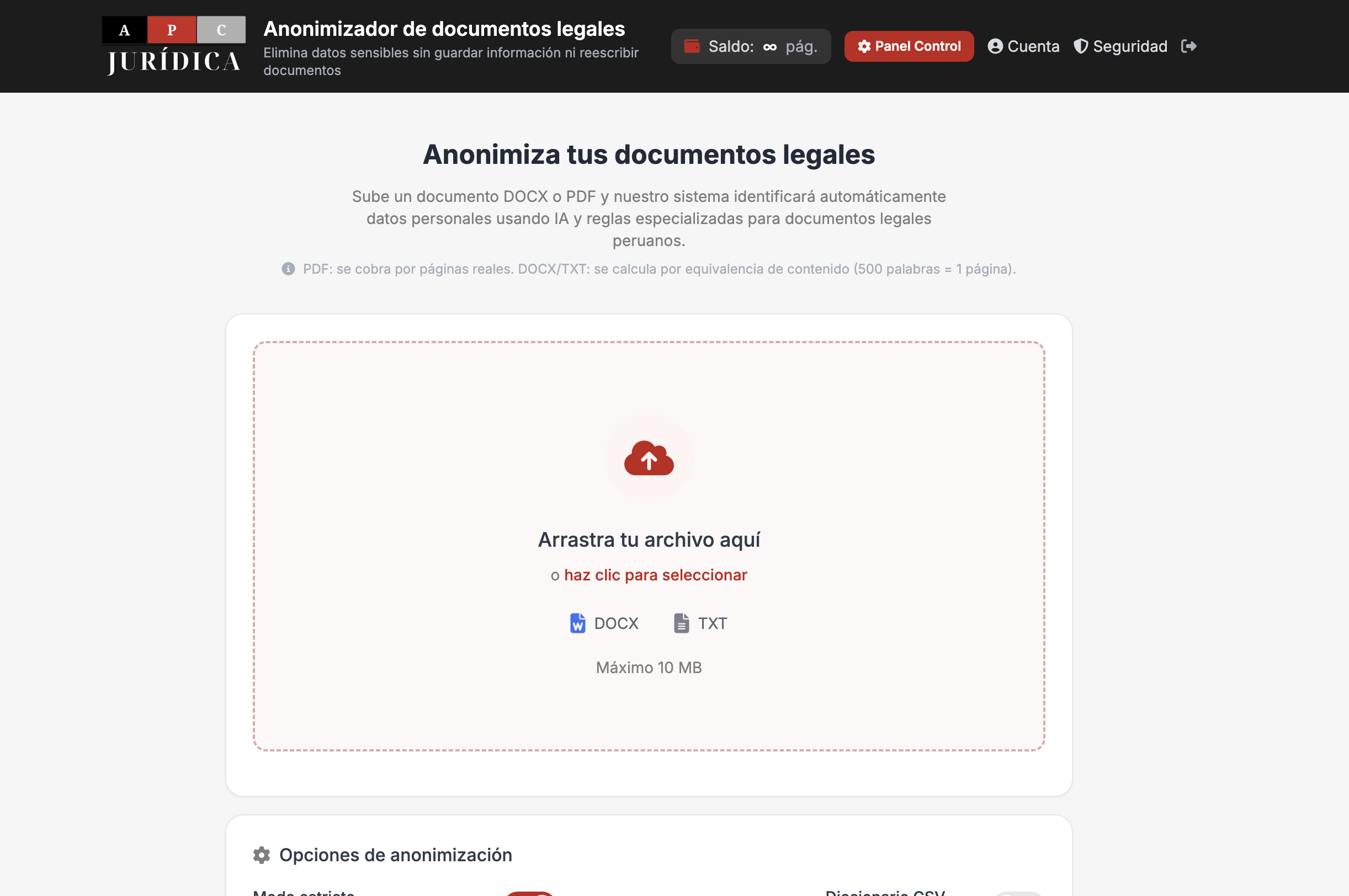 Ingresa al panel principal del anonimizador y arrastra tu archivo o haz clic para seleccionarlo.